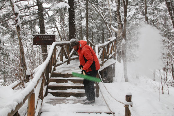 大年初一,長(zhǎng)白山普降瑞雪,公路積雪厚度近50厘米,服務(wù)先鋒黨小組以雪為令,小組中以黨員為骨干的清雪防滑隊(duì),凌晨就頂著星辰和寒風(fēng)開始清雪除障作業(yè),保證道路在山門開放前安全暢通達(dá)到開放要求,大家克服凜冽的寒風(fēng)完成1800米棧道積雪清理工作。