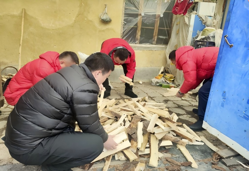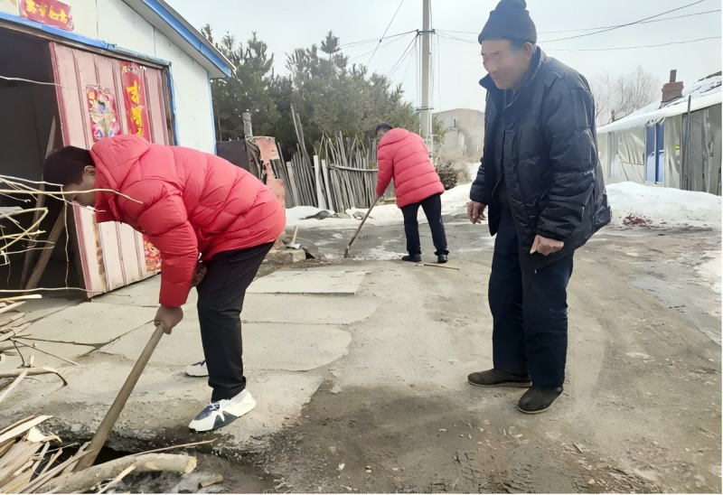 當(dāng)?shù)竭_(dá)老黨員家中,此時(shí)老人正坐在房前劈柴,看到隊(duì)員們的到來熱情地招呼大家。隊(duì)員們有的主動(dòng)從老人手上接過斧子劈起柴,并將劈好的柴火擺放整齊;有的拿起掃帚把院子掃得干干凈凈;有的找來長把斧子和鐵鍬在門前鑿開一條排水溝方便積水排水。看著整潔的院落、暢通的水溝和老人的笑容,隊(duì)員們勞動(dòng)的成就感油然而生。
