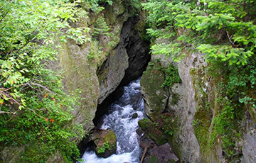 天池西側(cè)的梯云峰下,有一條長達(dá)十多公里的向下延伸的狹長溝壑,里面河道陡峭、澗水湍急,呈階梯狀迭落,所以人們叫它梯子河。河水流急,人們在很遠(yuǎn)處便可聽見隆隆聲響,聲震石壁的轟鳴聲,又叫地下暗河。它是地殼運動形成大型斷裂帶、斷面狹窄,寬處有三米多,最窄處一步便可跨過。兩壁懸崖直立,如刀削斧剁,潮濕光滑,平均十多米,最深處達(dá)三十米。它地處高寒地帶,每日不見陽光,每年的六月下旬,河面才開始化凍,且解凍期只有三個多月,里面溫度很低,只有攝氏三至四度。駐守在附近的邊防戰(zhàn)士,就把它當(dāng)做“天然冰箱”使用。俯視河谷,幽暗中澗流清亮湍急翻雪,冷涼的潮氣從下往上看奔涌,陰冷嚴(yán)森令人不寒而栗。河谷邊緣布滿了山藤蒿草、朽木枯枝,把谷口遮蔽起來,極難辨出,因此,生活在原始森林里的黑熊、野鹿、狍子、野兔等動物,在遷徒、獵食的奔跑中很容易跌落到河谷中喪生。由此,梯子河還有一個名字叫“獵物河”,人們常可在河里揀到封凍的獵物。