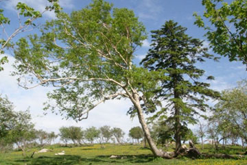 在長白山西坡一千六百米地帶,處處可見松樹和樺樹相依相偎生長在一起的動人情景:松樹高大挺拔,莊嚴(yán)肅穆,象一位陽剛偉岸的男子;樺樹枝葉舒展,體態(tài)婀娜,似一個柔媚俏麗的佳人。這種奇觀位于長白山的高山花園地帶下方,是針葉林和闊葉林的混合交界區(qū)域,分屬于兩個植被帶上的代表性植物松樹和樺樹,在這里就像兩位感情篤深的戀人一樣,根連根,枝攀枝,共生共長。他們既像一對對情侶,在如毯般鋪就的松軟草地上約會,又像在一起舉行盛大的集體婚禮,這就是陣容強大的“松樺之戀”景觀。實際上,這是因長白山頂部區(qū)域因海拔高,空曠風(fēng)大,土層淺薄且含水量大,單獨的松樹或樺樹在這里都不易生存,極易被山風(fēng)刮倒,而兩樹相伴共生,以松樹的根莖能深深扎入巖石的縫隙中,不被狂風(fēng)拔起,而岳樺的根須能廣泛地分布表層土壤中,起到穩(wěn)固的作用,這是植物與嚴(yán)酷的環(huán)境抗?fàn)幍漠a(chǎn)物,也是自然界長期選擇和淘汰的結(jié)果。在不同的季節(jié)里,“松樺戀”呈現(xiàn)出不同的景象。他們相互簇?fù)?、剛?cè)嵯酀?、生死在一起的決絕,自然引發(fā)人們給予他們美好情愛的敬仰和謳歌。人們常常躑躅他們面前生出無限感慨:看到松樺之戀,誰說草木無情!