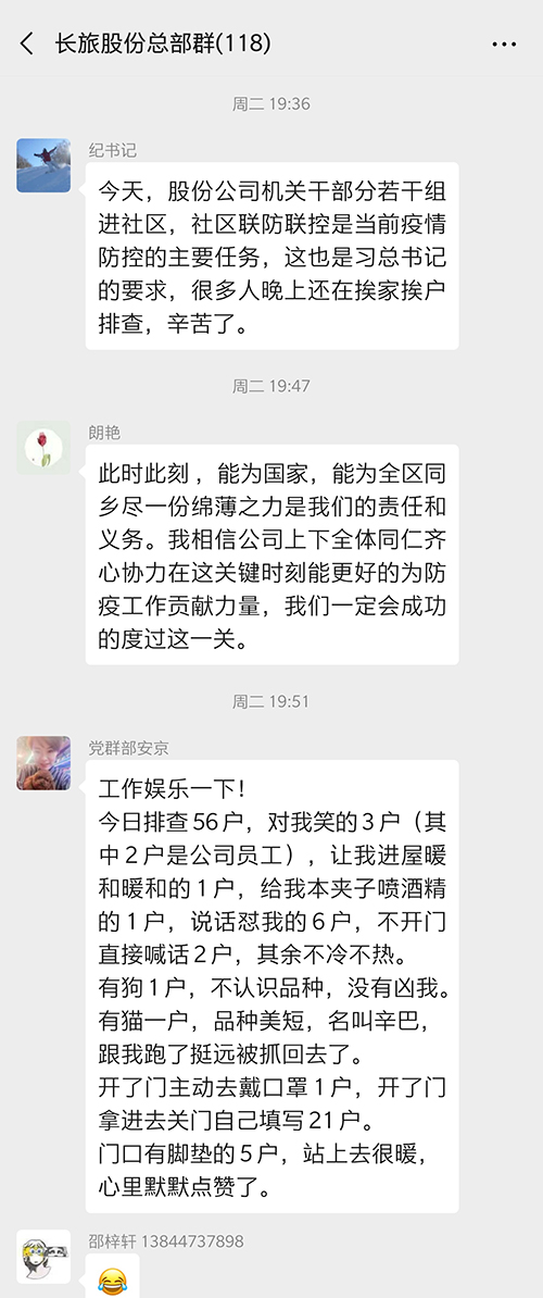 下班后,為了緩解疲勞,打氣加油,相互之間還在工作群內(nèi)開起玩笑,幽默的總結(jié)一天的工作情況,伴著僅有的一點(diǎn)歡樂和一天的疲憊憨憨入睡,養(yǎng)足精神繼續(xù)投身第二天的工作中,用實(shí)際行動(dòng)兌現(xiàn)“疫情不除,我們不退”的莊重誓言。