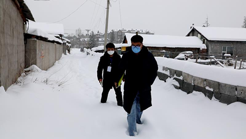 2月17日,長白山地區(qū)迎來了入冬以來規(guī)模最大的一場大雪,這為第二天的排查工作增添了不小困難。清早,雪花還沒有停止,漫天白雪里,我們依然聽到了“咯吱咯吱”的踩雪聲,原來股份公司的志愿者一早就已經(jīng)趟著膝蓋深的積雪,來到指定區(qū)域進行入戶排查登記。天寒地凍、大雪紛飛,雪水濕透了襪子,寒風(fēng)刺痛著臉頰,也不能阻擋股份人和全區(qū)人民一道戰(zhàn)勝疫情的信念和決心。